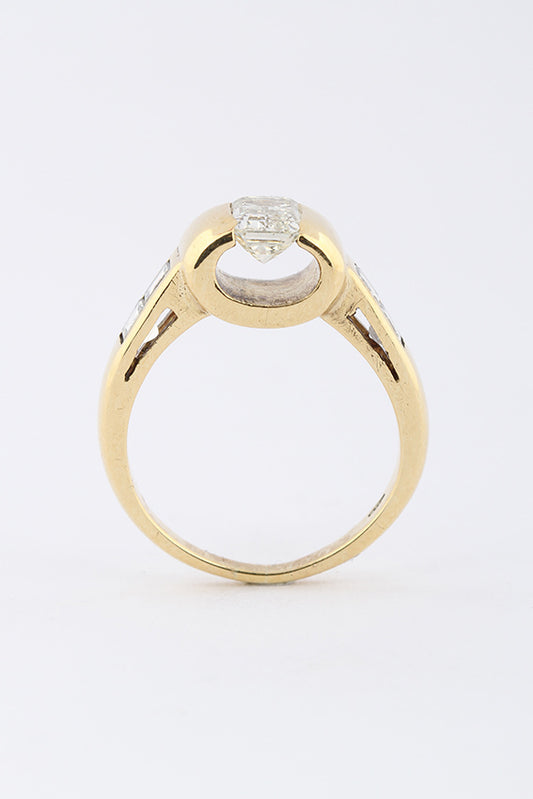 18 krt. gouden ring met grote diamant (smaragd slijpsel) en 4 carré geslepen diamanten.