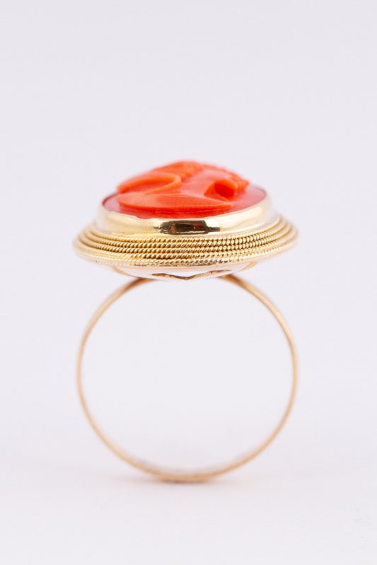 Gouden ring met camée voorstelling uitgesneden uit bloedkoraal