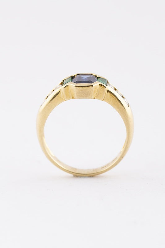 Gouden ring met saffier, smaragd en briljant