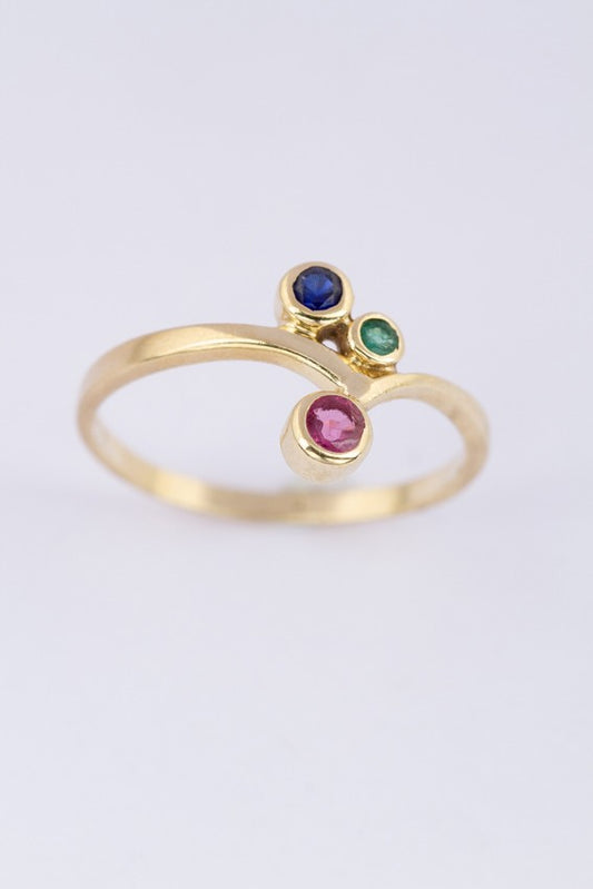 Gouden ring met smaragd, saffier en robijn