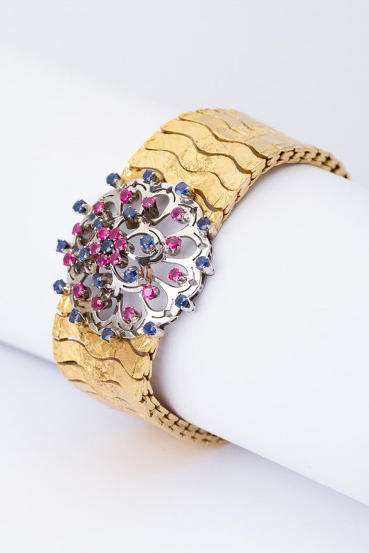 Gouden schakel armband met in het midden een wit gouden rozet met robijnen en saffieren