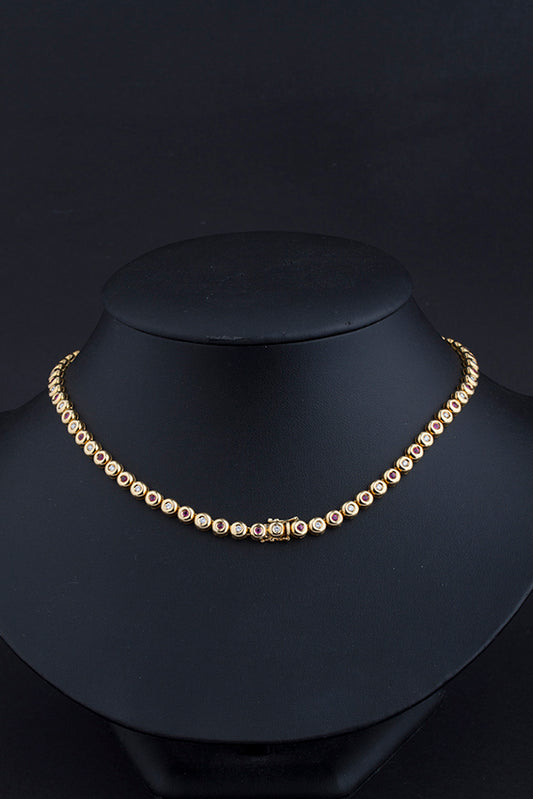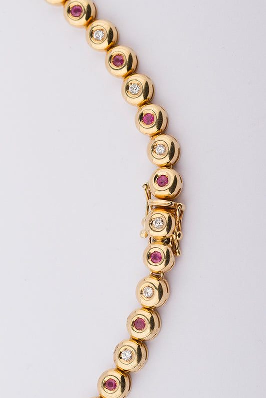 18 krt. gouden schakel collier met briljanten en robijnen (briljant totaal 1.11 ct. robijn totaal 1.63 ct. VSI).
