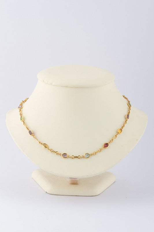Gouden schakel collier met diverse edelstenen.