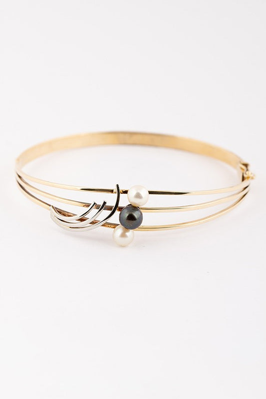 14 krt. Wit/geel gouden spangen armband met cultivé parels en scharnier sluiting.