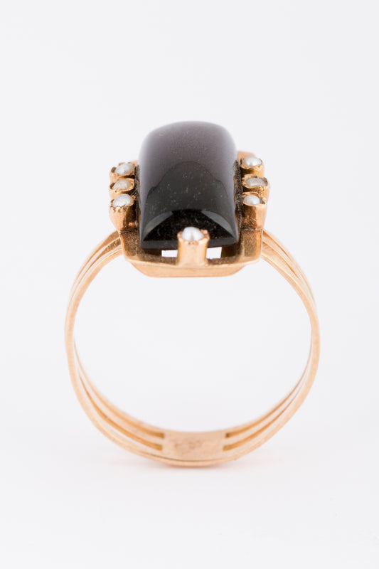Antieke 18 krt. gouden spangenring met zilverobsidiaan en parels.