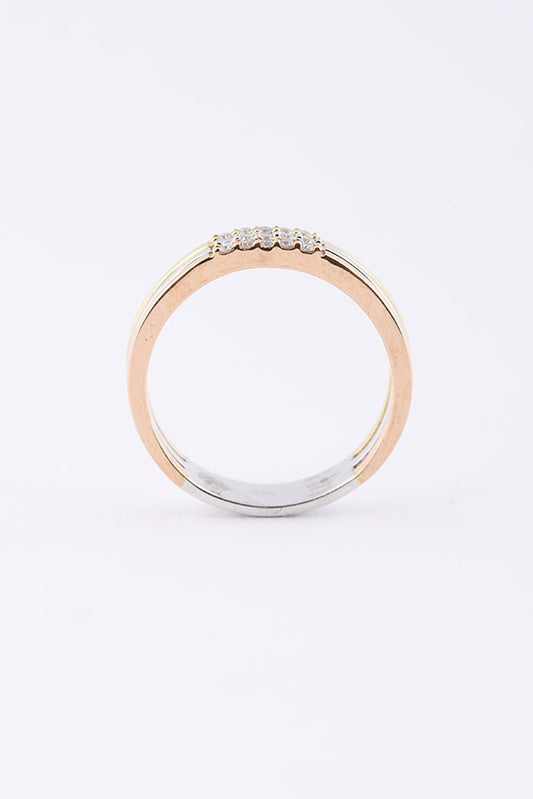 9 krt. gouden tri-color ring met 15 briljanten (bwg).
