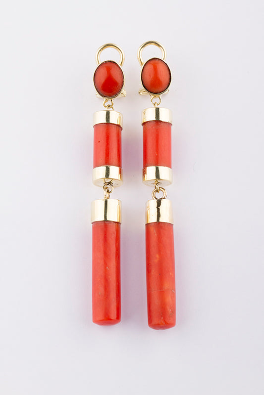 14 krt. gouden lange oorhangers met bloedkoraal.