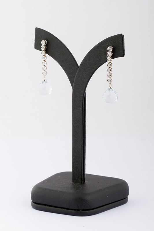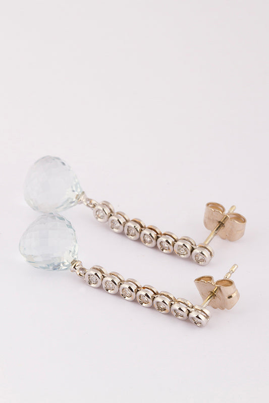 14 krt. wit gouden oorhangers met in elk 7 briljanten en een briolet geslepen aquamarijn.
