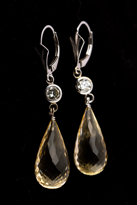 14 krt. Wit gouden oorhangers met in elk een briljant geslepen diamant. Totaal ca. 0.80 ct. met briolet geslepen citrien.