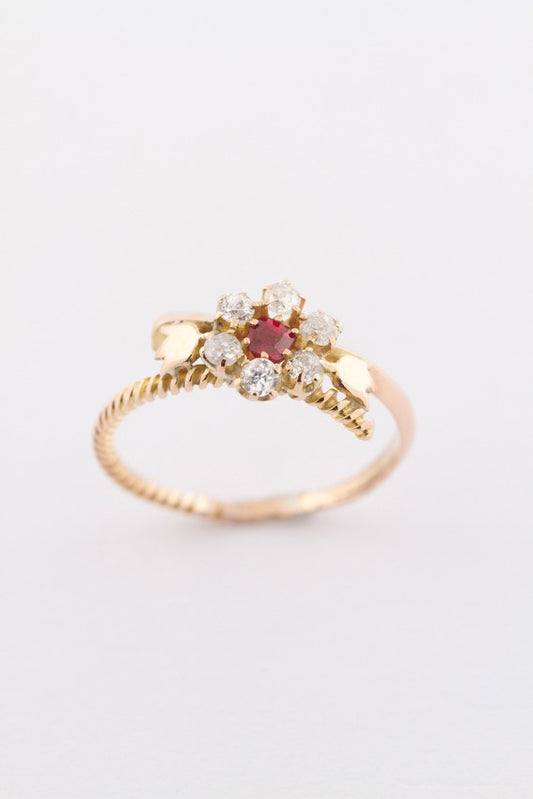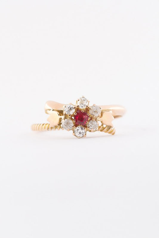Oude entourage ring met robijn en 6 oud geslepen briljanten (bwg)