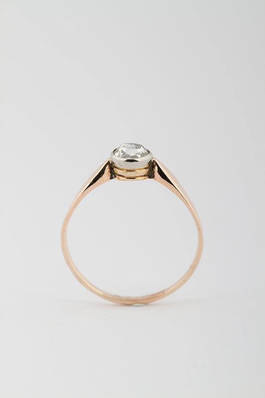 Oude 14 krt. gouden solitair ring met een roos geslepen diamant in zilver gezet.