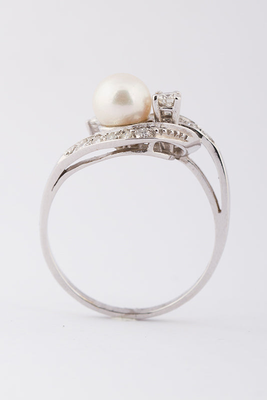 18 krt. wit gouden slagring met 3 briljanten en 10 diamanten met cultivé parel.