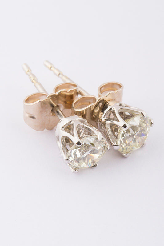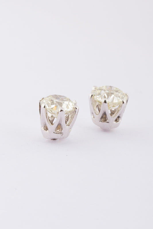 14 krt. wit gouden solitair oorknoppen met in elk een oud geslepen briljant van ca. 0.75 ct. Totaal ca. 1.5 ct.