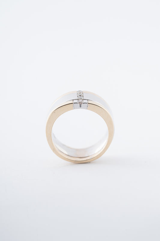 14 krt. wit/geel gouden ring met 4 briljanten, totaal ca. 0.09 ct. van het merk: Le Chic (kleine maat).