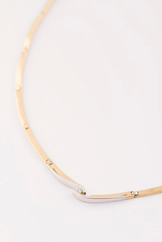 14 krt. wit/geel gouden schakel collier met in het midden een briljant van ca. 0.14 ct.