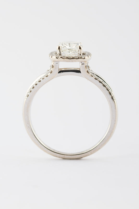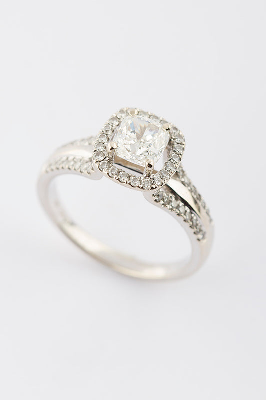 18 krt. wit gouden entourage ring met een 'cushion' geslepen briljant van 1.08 ct. Op de gespleten band en rond de middensteen 48 briljanten (0.36 ct.). Totaal ca. 1.44 ct.
