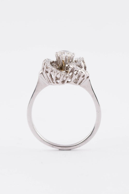 14 krt wit gouden entourage ring met een briljant in het midden van ca. 0.42 ct en 24 diamanten (8-kant). Totaal ca 0.75 ct.