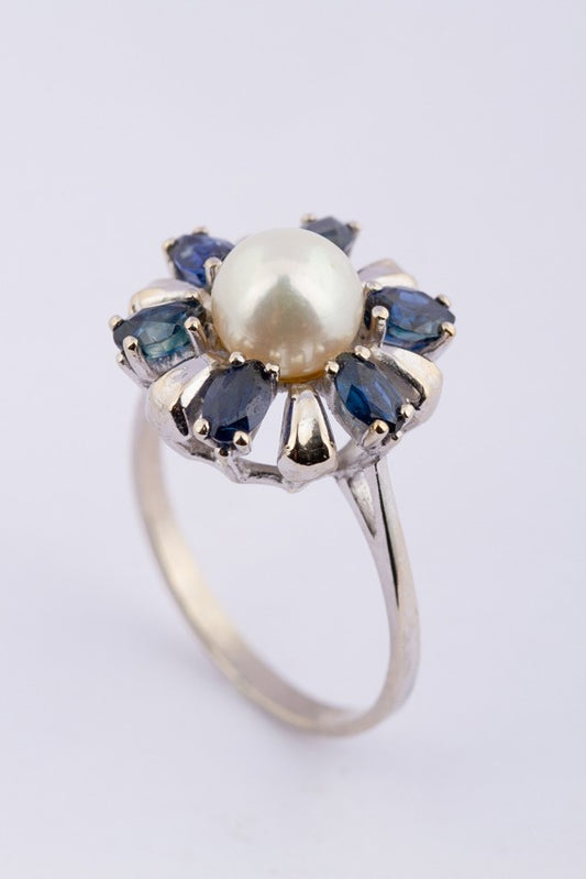 Wit gouden entourage ring met cultivé parel en saffieren