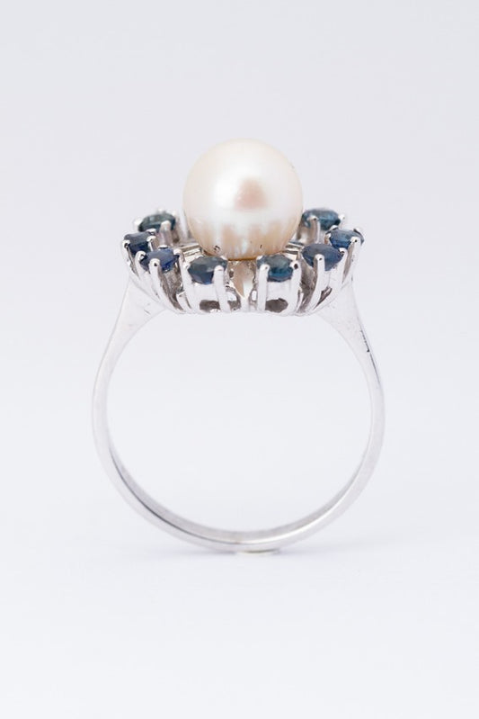Wit gouden entourage ring met cultivé parel en saffieren