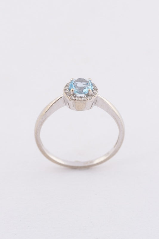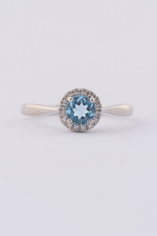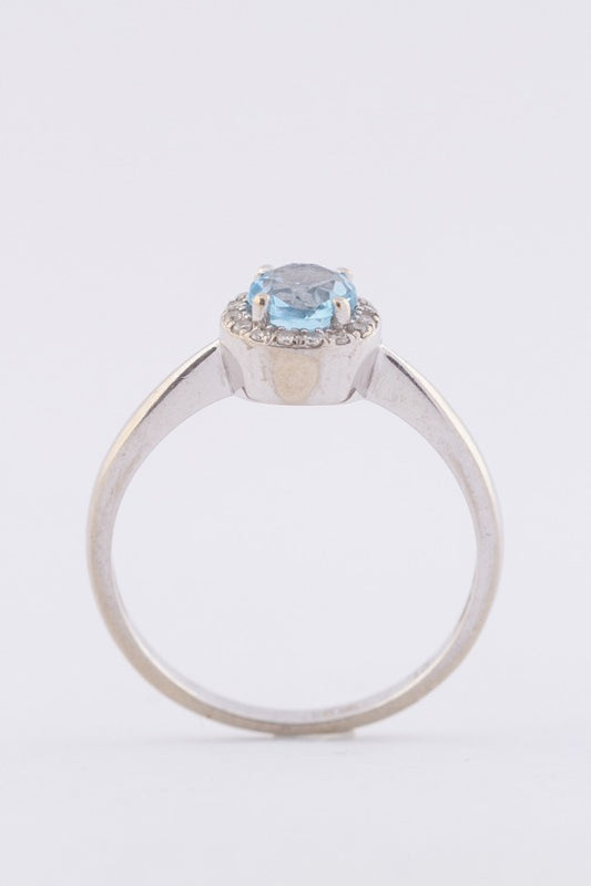 Wit gouden entourage ring met een blauwe topaas en briljanten