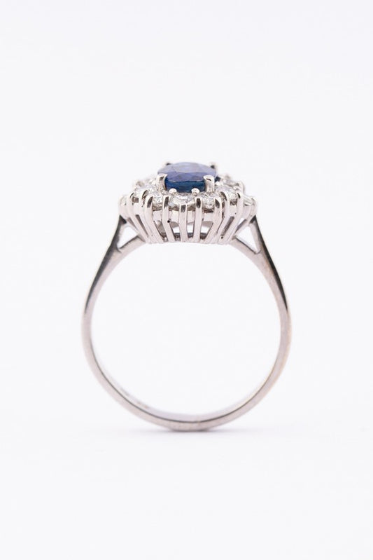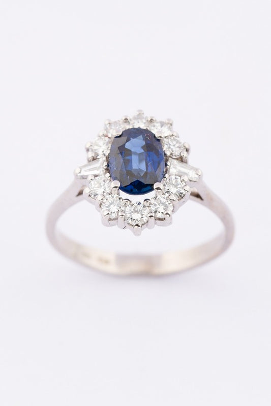 14 krt. wit gouden entourage ring met een ovaal geslepen saffier, 10 briljanten en 2 taper baguette geslepen diamanten. Totaal ca. 0,05 ct.
