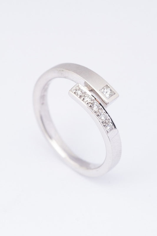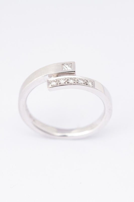 Wit gouden gematteerde slag ring met een prinses geslepen briljant van en rond geslepen briljanten