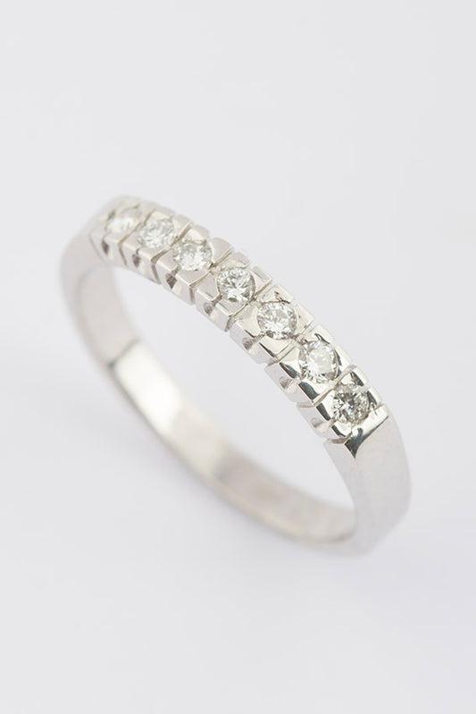 14 krt. wit gouden rij ring met 7 briljanten. Totaal ca. 0.21 ct.