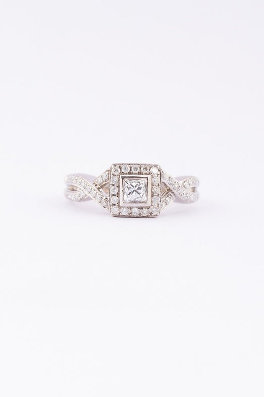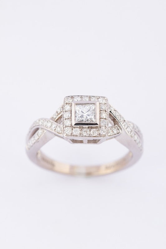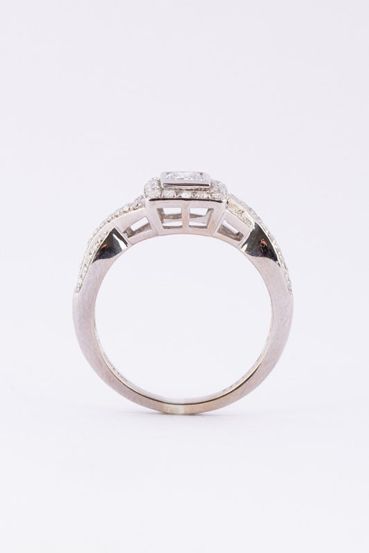 Wit gouden ring met een prinses geslepen diamant en briljanten
