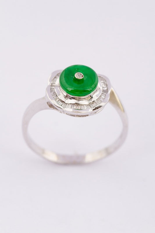 Wit gouden ring met jade, briljant en baguette geslepen diamanten