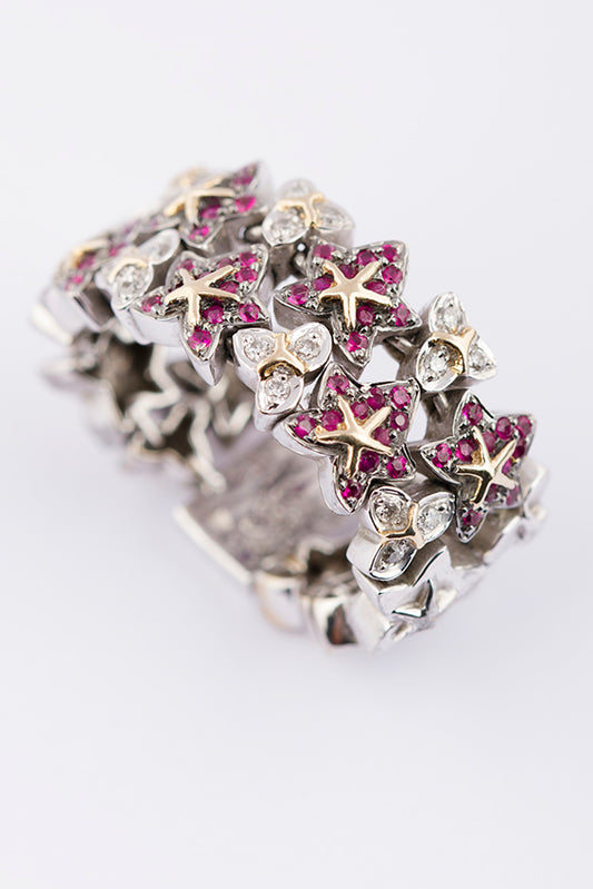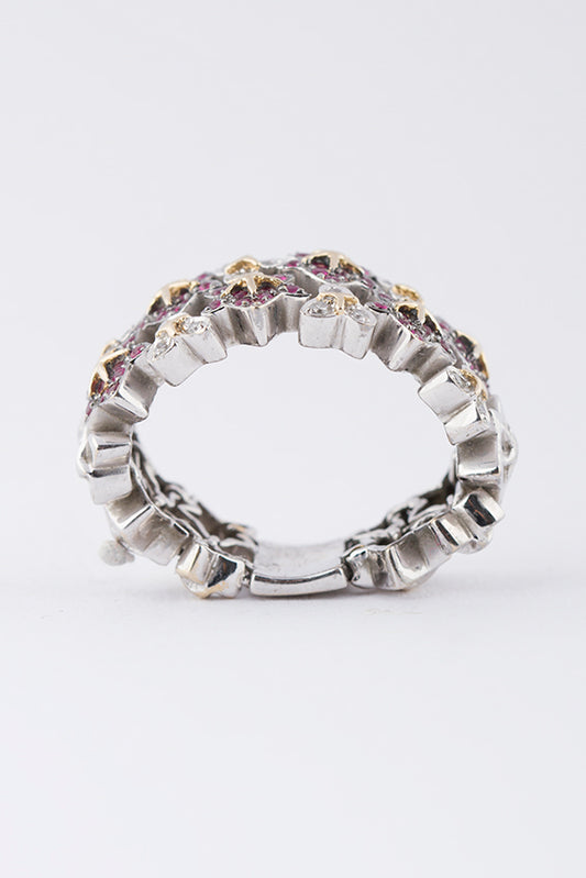 18 krt. wit gouden schakel ring met briljanten en robijn.