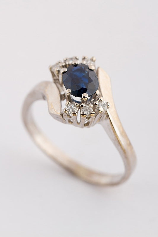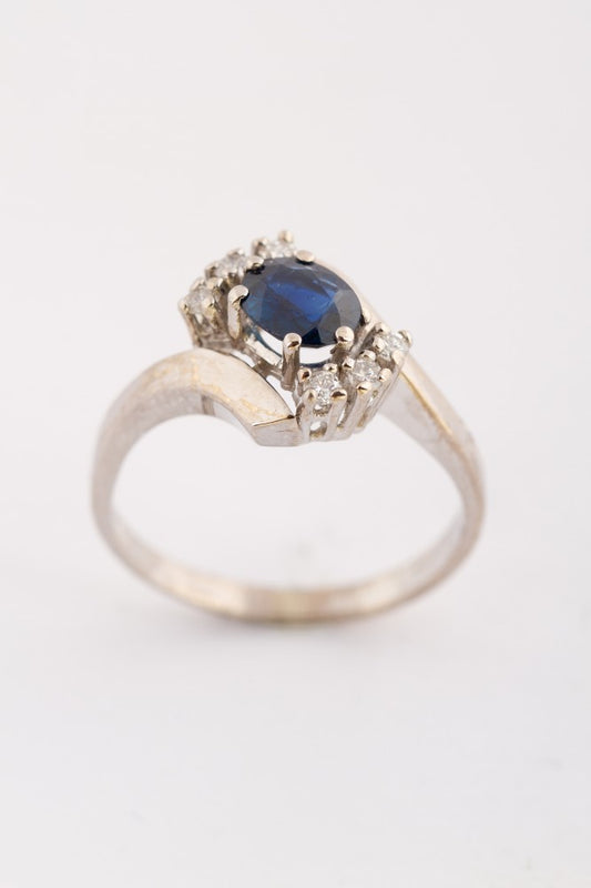 14 krt. wit gouden slagring met een saffier en 6 briljanten.