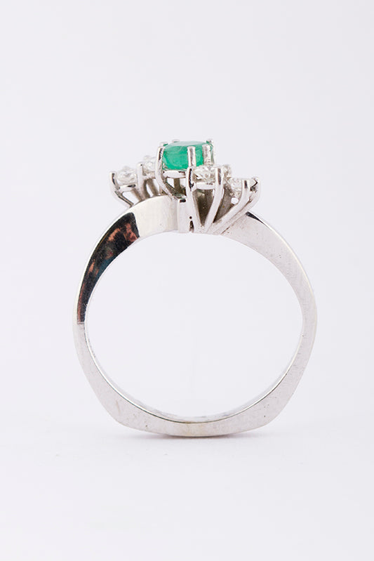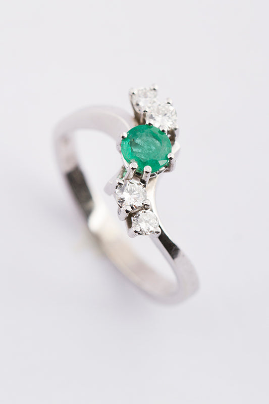 14 krt. wit gouden slagring met smaragd en 4 briljanten. Totaal ca. 0.24 ct.