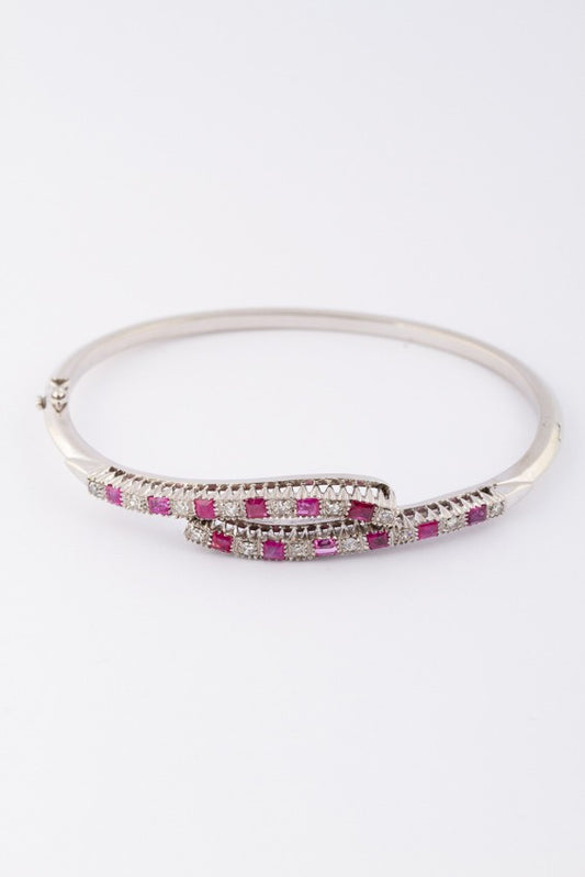 18 krt. wit gouden slaven armband met 12 carré geslepen robijnen en 14 diamanten (8-kant). Totaal ca. 0.21 ct. (Scharniersluiting).