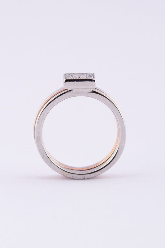 14 krt. wit/rosé gouden ring met een prinses geslepen briljant en 12 rond geslepen diamanten. Rosé ring is los en uit de ring te halen.