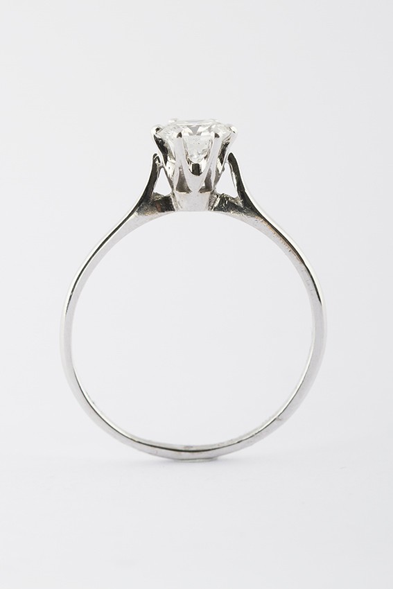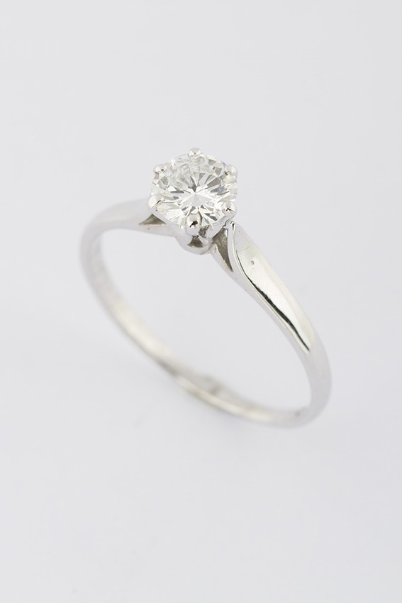 14 krt. wit gouden solitair ring met een briljant van 0.58 ct. Kwaliteit: VS2. Kleur: E. Met HRD Antwerpen certificaat.