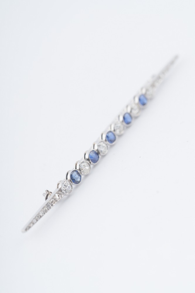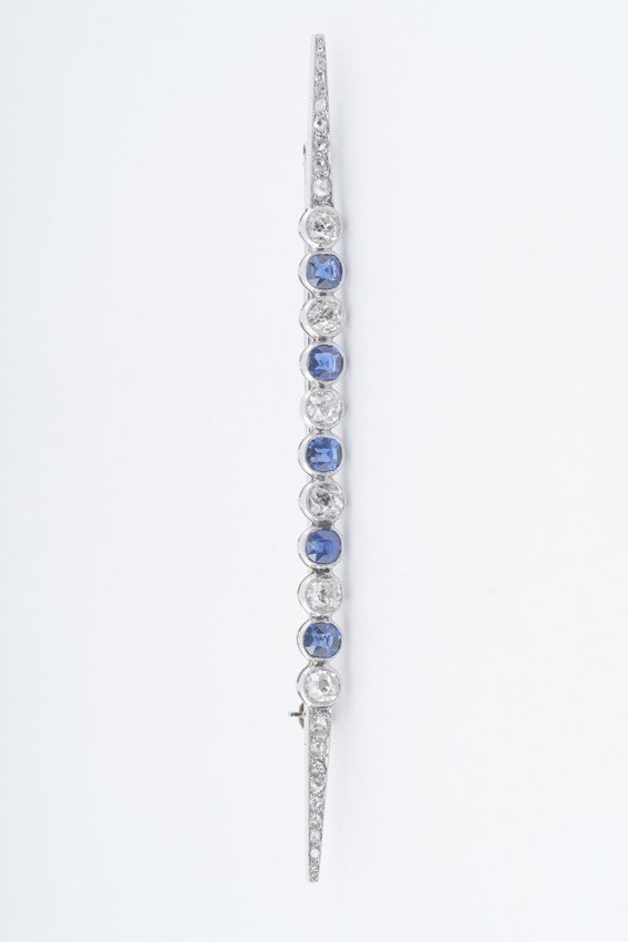 Antieke 14 krt. wit gouden brochette met 5 saffieren, 6 oud geslepen briljanten en 18 roos geslepen diamanten tot. ca. 1.00 ct.