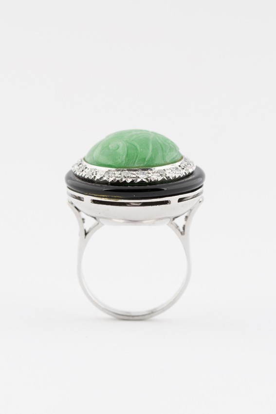 18 krt. wit gouden cocktail ring met jade, onyx en 26 briljanten. Totaal ca. 0.5 ct.