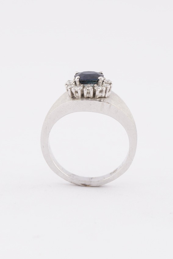 14 krt. wit gouden gematteerde entourage ring met saffier en 10 briljanten. Totaal ca. 0.20 ct.