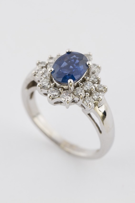 14 krt. wit gouden entourage ring met saffier (1.55 ct.) en 18 briljanten. Totaal ca. 0.60 ct.