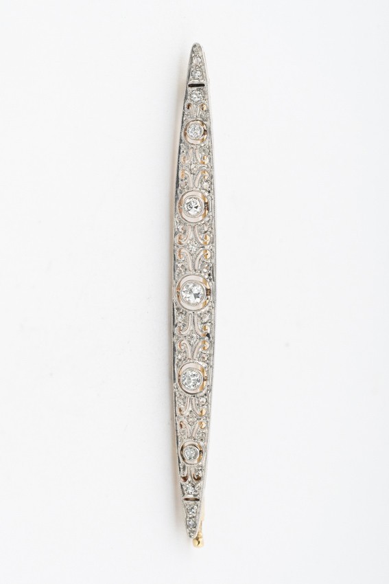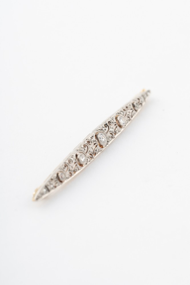 14 krt. wit/geel gouden brochette met 5 briljanten totaal ca. 0.20 ct. en roos geslepen diamanten.